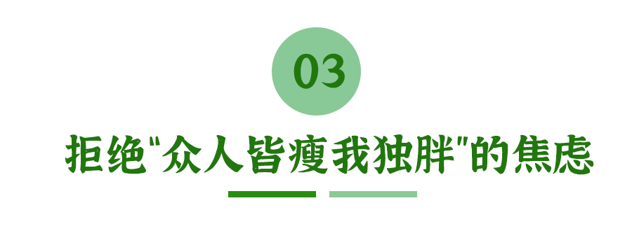 所以,如果可以的话,希望坚持读到这里的你,能够放下手中的黄瓜和代餐,摒弃对于瘦的“执念”,拒绝“众人皆瘦我独胖”的焦虑,喜爱、接纳并且欣赏自己的身体,做一个健康、自信且快乐的人。