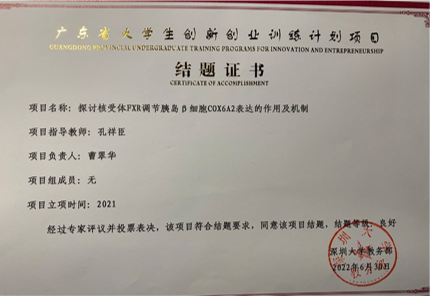 曹翠华负责的基础医学项目“探讨核受体XR调节胰岛β细胞COX6A2表达的作用及机制”结题证书