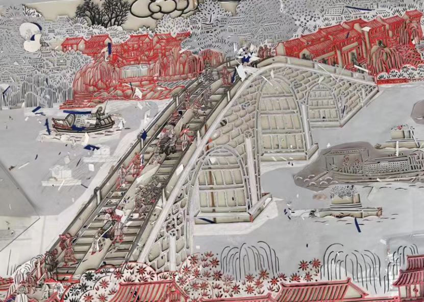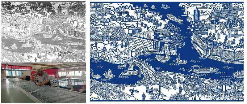 想来容易做来难,哪里去找整幅100米还没有接头的纸?杨兆群先在深圳某纸厂定制了三张,结果要么是中间有接头,要么就是长度不达标,于是杨兆群转头找到了自己在安徽宣纸厂的朋友,“做第一张的时候,到27米就断了,后来试了好几次,总算才成功了。”这么长的纸卷,怎么刻也成了大问题,“我们采用了很多新的技法。因为百米纸卷容易断裂,所以我们先在纸上复胶,这样纸有弹力不易断,但刻的难度增加了。最后装裱也是特意买了一台1.6米宽的机器回来高温压烫粘合,所以这个作品才是一个完整的、完全没有接头的。”从2018年开始整理搜集大运河资料到刻纸长卷《大运河》最终完工,时间已经来到了2021年的9月。刻纸《大运河》在中国大运河博物馆等多地展出过,其细节之精致考究、规模之巨大令不少观者啧啧称奇。
