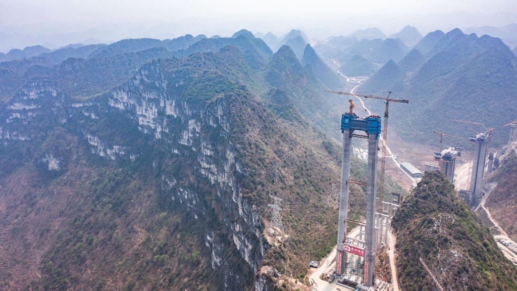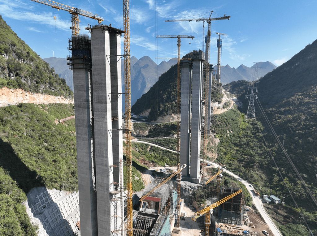 2016年,连接云贵两省的七跨连续钢桁梁斜拉桥——北盘江大桥,以世界第一的565米垂直高度横跨高原之上。
