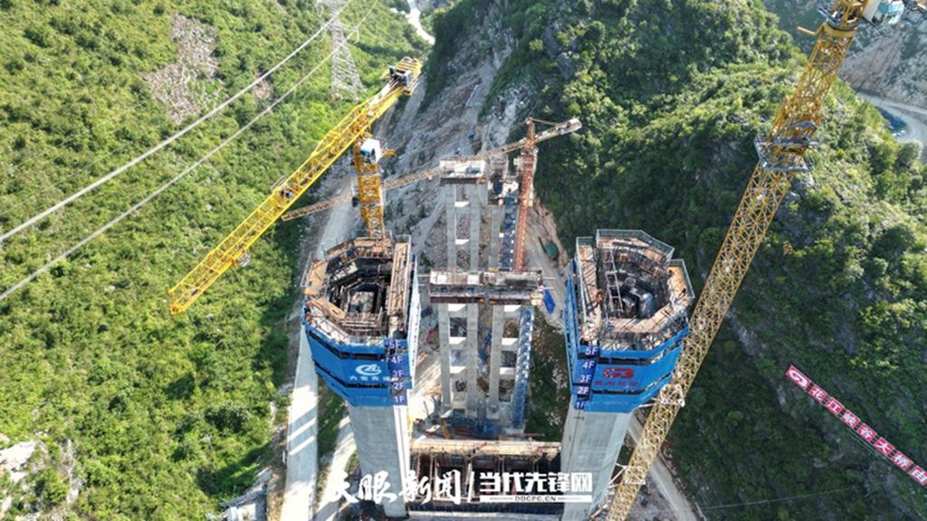5月14日,记者乘坐施工电梯升到近200米高的桥塔平台俯瞰,花江峡谷大桥5号与6号主塔隔峡相望,拔地而起的高柱耸立于悬崖峭壁,桥下的北盘江宛如蓝色丝带静卧于大峡谷的怀抱中。目前,大桥总体形象进度已完成39%。