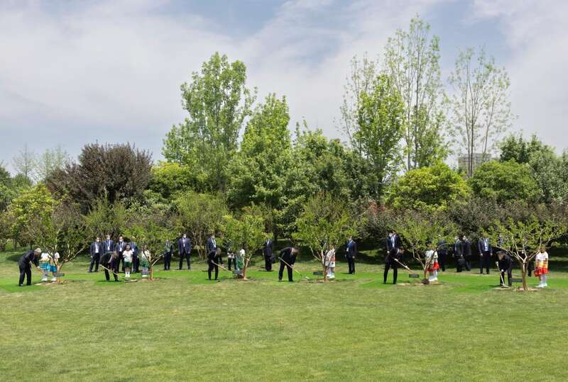 在一棵棵西府海棠前,习近平主席和外方领导人拿起铁锹,弯腰培土,并拎起木桶为树苗浇水。