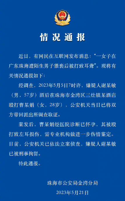 珠海公安通报“女子遭陌生男子猥亵后被打致左耳损伤”:嫌疑人被刑拘