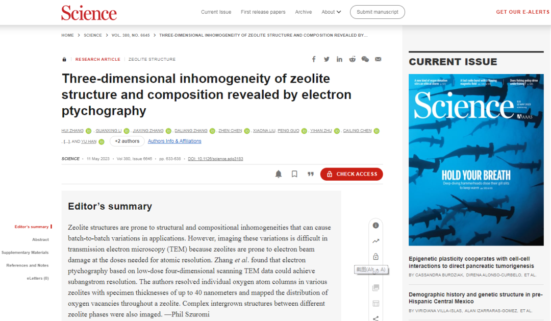 5月12日,以 “Three-dimensional inhomogeneity of zeolite structure and composition revealed by electron ptychography” 为题,华南理工大学张辉教授和阿卜杜拉国王科技大学(KAUST)韩宇教授的合作研究成果在Science上发表。其中,张辉教授和KAUST李冠星博士为共同第一作者,张辉教授和KAUST韩宇教授为共同通讯作者,华南理工大学是第一通讯单位。