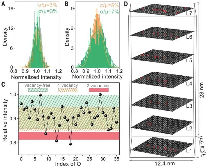 由于T原子柱和O原子柱在Ptychography图像中被清晰地区分开,作者对其强度进行了定量分析,分析发现样品中存在O空位。作者用图像模拟定出了可用于O空位识别的强度阈值,并应用于实验数据,得到了ZSM-5中O空位的三维分布(图3)。该方法得到的O空位含量与吡啶吸附方法测得的路易斯酸位点的数量基本相符。这对进一步研究沸石分子筛中酸性位点的分布具有重要意义。