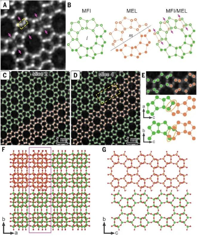 ZSM-5(MFI)与ZSM-11(MEL)这两种结构相似的分子筛经常共存,但学界对它们的共存状态是混合还是共生仍不十分清楚,对其相界面结构也知之甚少。作者借助Ptychography的超高分辨率成像能力,清晰解析了MFI-MEL相界面沿a轴、c轴方向的原子结构,并建立了b轴方向的界面原子模型(图4)。