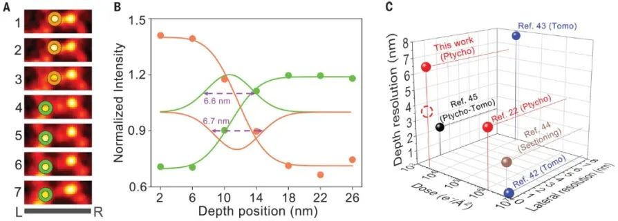 最后,作者分析了低剂量条件下,多层法Ptychography重构的纵向分辨率(depth resolution)。计算表明,虽然Ptychography的横向分辨率低于1 Å,但是其纵向分辨率只有~6.6 nm(图5)。
