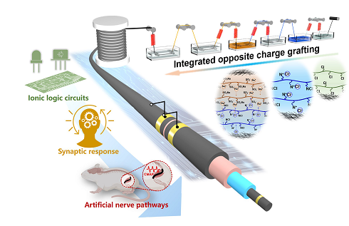 东华大学纤维材料改性国家重点实验室王刚研究员等联合复旦大学附属华山医院手外科临床团队,首次在一维曲面结构表面实现了纳米尺度离子异质结的可控构筑,获得了具有千米级制造潜力的电子-离子杂化半导体纤维器件。基于信号在纤维离子结界面的单向传输特性,设计开发了纤维状离子半导体核心元器件(离子二极管、离子双极结型晶体管),并通过集成的纤维离子逻辑门,初步实现了离子信号的“0-1”逻辑运算。此外,其可作为神经接口,实现对周围神经损伤后远端神经的持续电刺激,延缓远端肌肉萎缩,为神经损伤后错过早期治疗的患者恢复更好的运动功能提供了可能性。相关研究近日发表于《自然 · 通讯》。