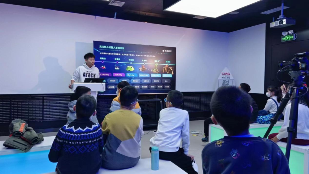 来自格斗机器人社团的机电学院2020级本科生陈征正带领小朋友们走进格斗机器人的世界。当各式各样的机器人种类出现在大屏幕上,小朋友们的注意力都被这些五颜六色、形状各异的小机器人深深吸引。