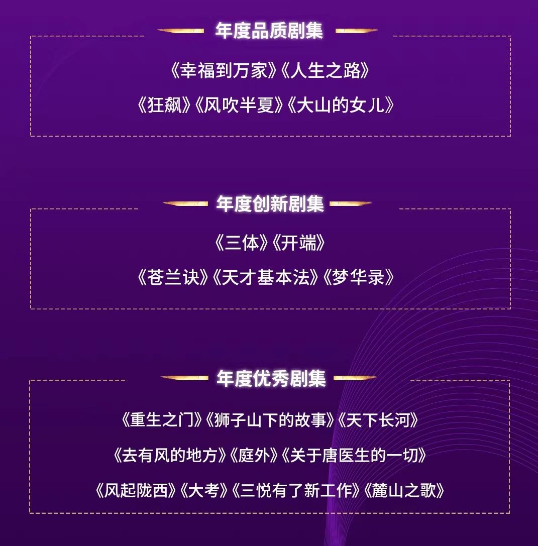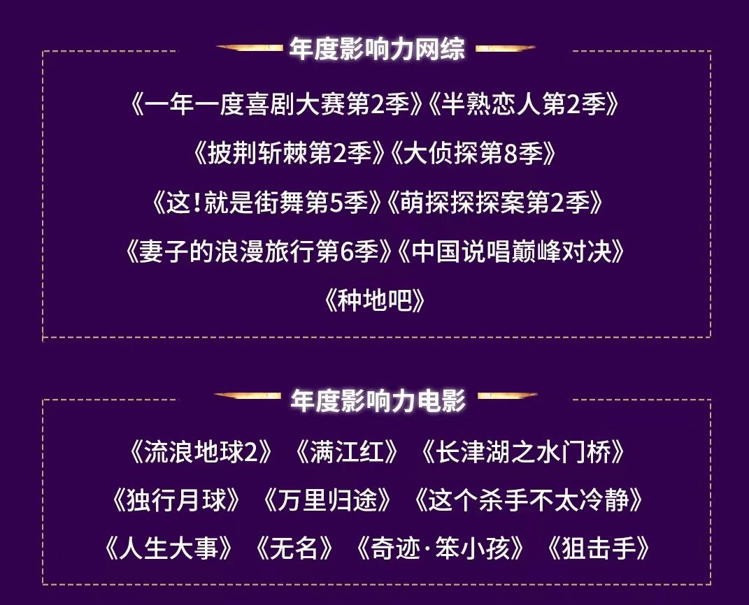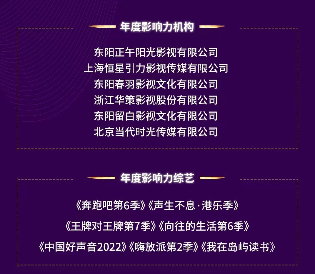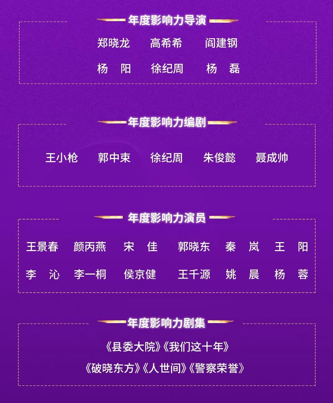 曹平 、严从华 、白一骢、王一栩 、李路、戴莹获“年度影响力制片人”;郑晓龙、高希希、阎建钢、杨阳、徐纪周、杨磊获“年度影响力导演”;王小枪 、郭中束、徐纪周、朱俊懿、聂成帅获“年度影响力编剧”;王景春、颜丙燕、宋佳、郭晓东、秦岚、王阳、李沁、李一桐、侯京健、王千源、姚晨、杨蓉获“年度影响力演员”。
