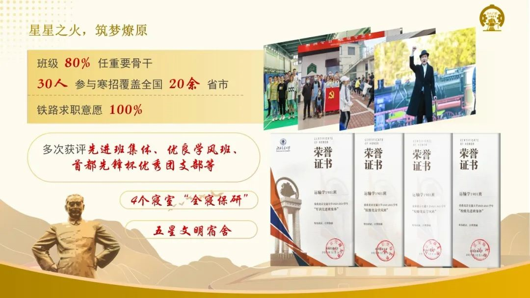 为增强班级凝聚力,他们独创“相约四季”活动——春日共读经典、夏日共健体魄、秋日共赏杏黄、冬日共品饺香。组建五所交大 “詹天佑班联盟”,共奏交通强国最强音。班级上下同心、齐头并进,斩获学校最高荣誉“周恩来班”。