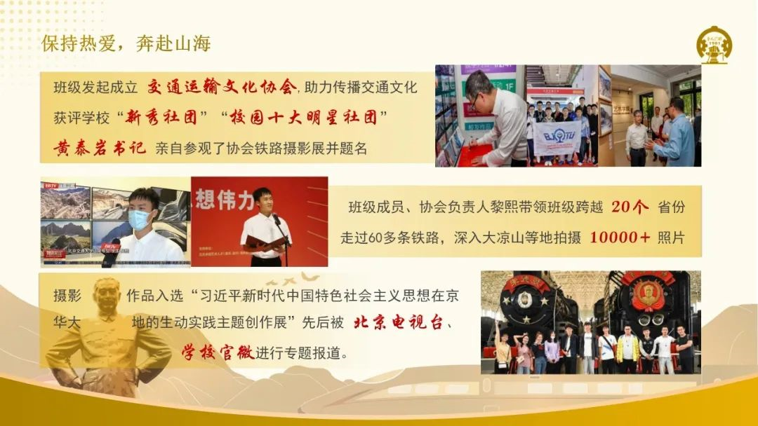脚步丈量大地,服务国家战略。班级同学走近四川大凉山、体察贫困深处,结对帮扶贵州福泉中学,将班级奖学金用于捐助脱贫攻坚项目。他们热爱铁路专业,创办交通运输文化协会,踏过20个省份,追过60多条铁路,拍摄近万张照片,“追火车的交大青年”先后被人民日报、光明日报、学习强国等宣传报道。