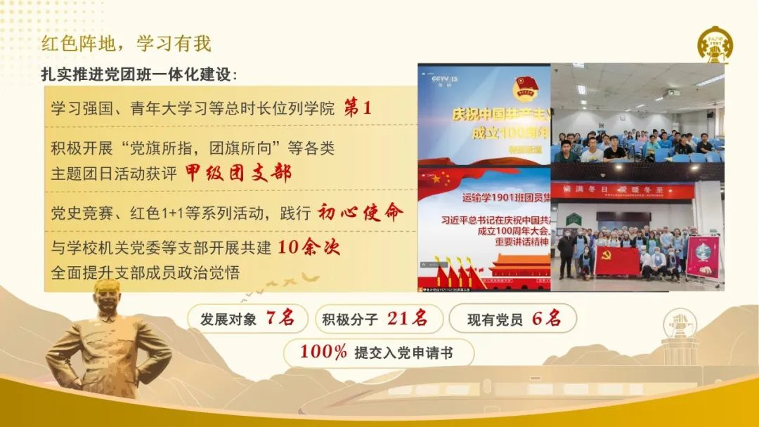 作为交通运输学院2019级詹天佑班,他们积极传承詹天佑精神,于詹天佑纪念馆览伟人风采,于青龙桥下忆詹公报国豪情,在红色 1+1 党建主题活动中践行初心使命。织密“党—团—班—舍”四级网格,建立党员责任区,班级100%提交入党申请,100%成为入党积极分子,实现党建引领全覆盖。