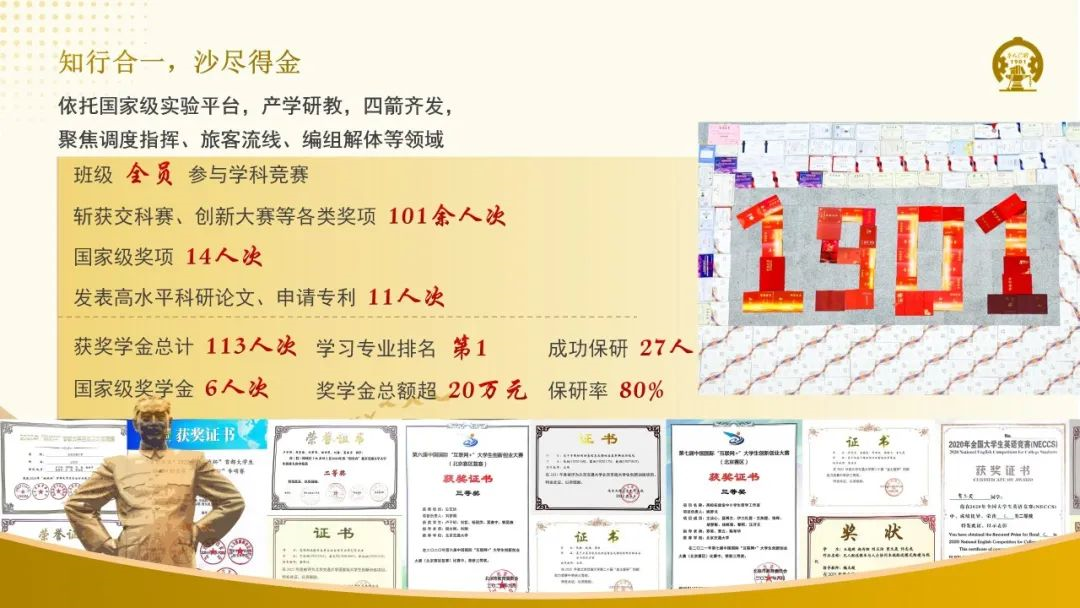 为营造优良学风,班级创建“234”学习体系,打牢铁路专业基础。打造1+N 学习模式,提升同学们的综合素养。班级27人成功保研,保研率80%,4个宿舍“全寝保研”。获奖学金总计113人次,总额超20万元,覆盖率100%。班级全员参与学科竞赛,斩获国家级奖项19 项,省部级奖项18 项,论文专利11 项。让研究更“见底”、让学习更“有效”。