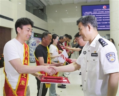 昨日,天津市见义勇为协会、和平区见义勇为协会在公安和平分局召开表彰大会,对5月23日在和平区山西路附近勇于制止不法侵害行为的7名群众进行表彰,并向吴树全、安稳等7名见义勇为群众颁发荣誉证书和奖金。