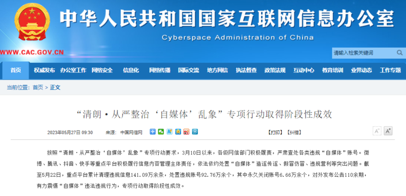 按照“清朗·从严整治‘自媒体’乱象”专项行动要求,3月10日以来,各级网信部门积极履责,严肃查处各类违规“自媒体”账号。微博、腾讯、抖音、快手等重点平台积极履行信息内容管理主体责任,依法依约处置“自媒体”造谣传谣、假冒仿冒、违规营利等突出问题。截至5月22日,重点平台累计清理违规信息141.09万余条,处置违规账号92.76万余个,其中永久关闭账号6.66万余个,对外发布公告110余期,有力震慑“自媒体”违法违规行为,专项行动取得阶段性成效。