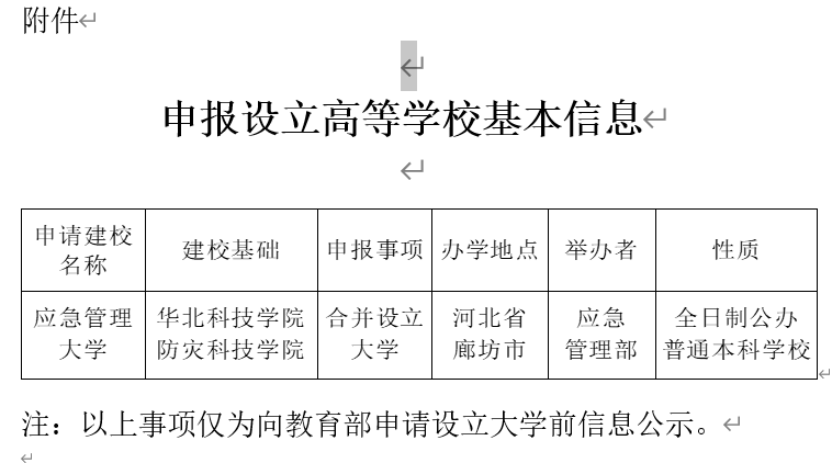 根据《中华人民共和国高等教育法》《普通高等学校设置暂行条例》《普通本科学校设置暂行规定》等有关规定,经组织专家考察、评议,拟向教育部申报设立应急管理大学,现予公示。公示时间为2023年5月29日至6月2日。