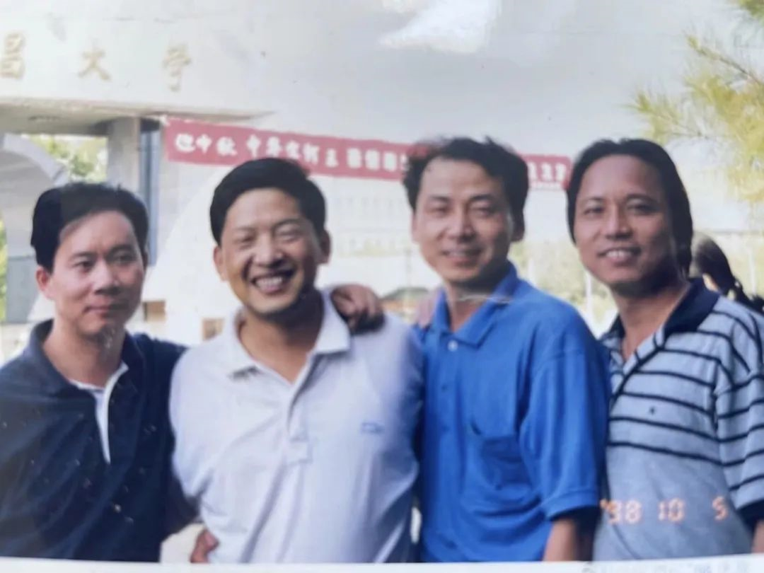 1998年法律系“胡涂编筐”四位老师在校门口合照