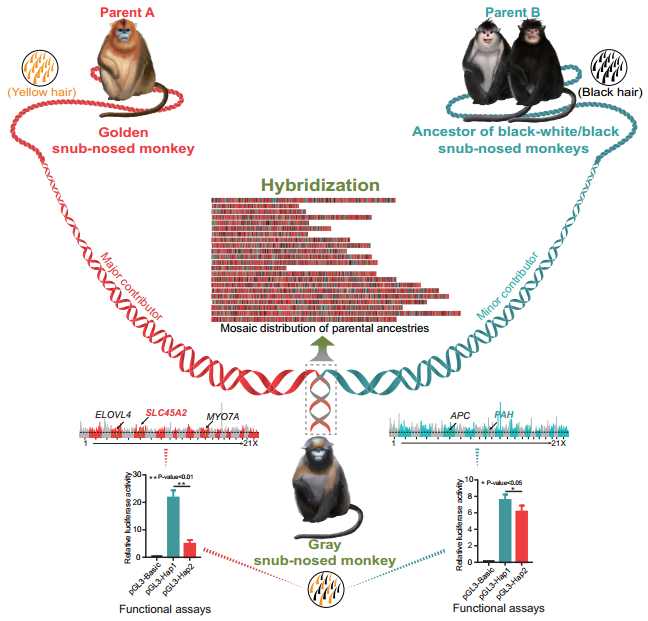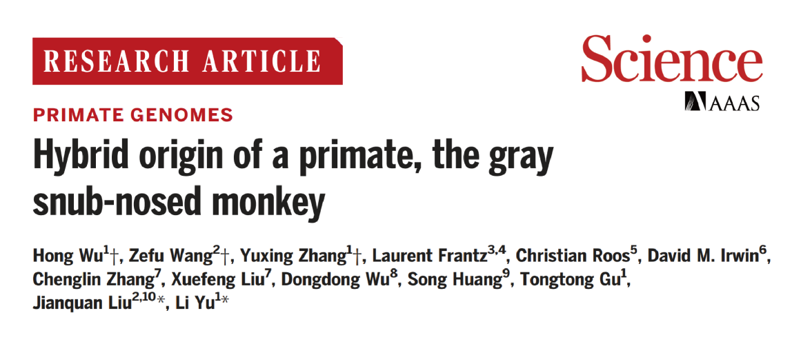 2023年6月2日,云南大学于黎研究员团队和四川大学刘建全教授团队在国际顶级学术期刊Science上发表题为“Hybrid origin of a primate, the gray snub-nosed monkey”的长篇研究论文(Wu et al., Science 380, eabl4997, 2023)(图1)。研究人员揭示了灵长类动物黔金丝猴(Rhinopithecus brelichi,the gray snub-nosed monkey) 的杂交起源和其独特毛色产生的分子机制(图2)。这是于黎研究员团队继2016年在Nature Genetics发表金丝猴高原环境适应性进化机制的研究论文之后取得的又一突破。