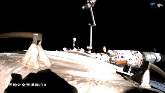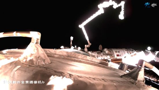 而小臂肘部相机则从多个角度带着大家巡视了浩瀚太空中的空间站,见证了实拍出来的三舱两船构型。