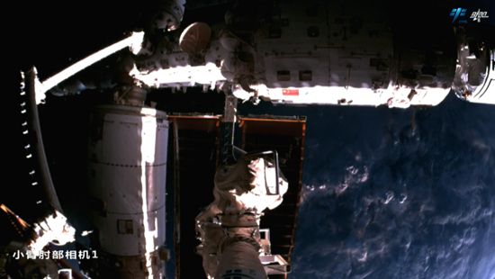 本次直播,小臂肘部相机1首先从梦天舱外国旗凝视点开始拍摄。从这个角度不仅可以看到梦天舱舱壁上的国旗与中国载人航天工程标识,还可以看到远处天和核心舱舱壁上的国旗与工程标。空间站三舱舱壁上均绘制了国旗与工程标,鲜艳的红与沉着的蓝在浩瀚宇宙中交相辉映。