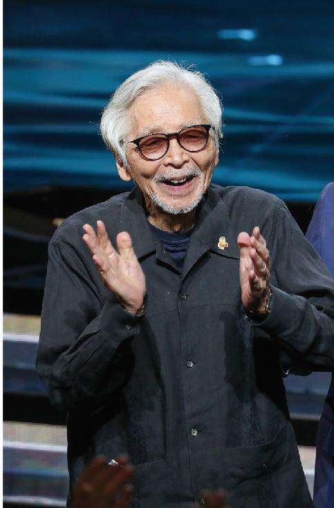 山田洋次在金爵奖颁奖典礼上向观众致意。文汇报记者 叶辰亮摄 制图:张继
