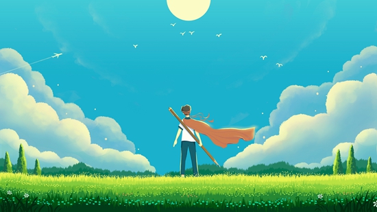 他坐在草坪中央的那堆书上,眯着眼注视着天际缓缓落下的圆日,一股突如其来的恐慌感笼罩了他的心头。他急急忙忙地起身。这时,书堆中的一本书突然翻开,静静地飘浮在他的胸前。他深吸一口气,纵身跃上了那本书。