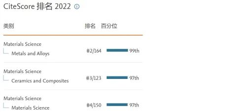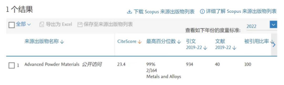 中南大学主办、中国工程院院士黄伯云 和 美国工程院院士Chain-Tsuan Liu共同 担任主编的 新刊《先进粉体材料》(Advanced Powder Materials)获得了首个CiteScore,23.4分 ,在 全球材料科学学科、金属与合金子学科的164本期刊中排名第2,进入Q1区。