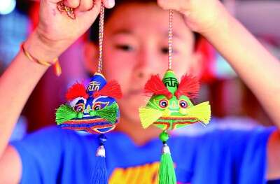 在山东无棣县古城风景区,小朋友展示选购的香囊。新华社发