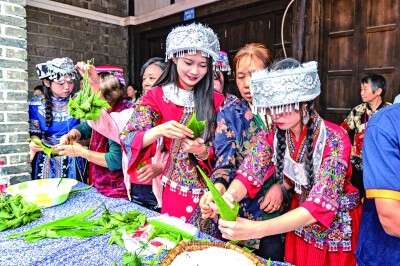 在重庆永川区板桥镇板桥老街,村民和游客一起包粽子。新华社发