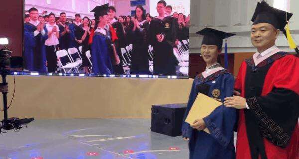 在毕业生代表发言环节,一名女生被引导着走上台发言,她就是全国首位视障播音硕士毕业生董丽娜。