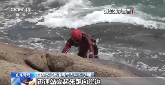 国家水域救援青岛大队 牛永利:当海浪把人冲到岸边,海浪在膝盖以下位置时,迅速站立起来跑向岸边。