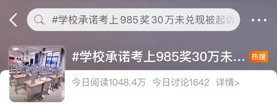 6月29日,话题#学校承诺考上985奖30万未兑现被起诉#登上微博热搜,引发关注。