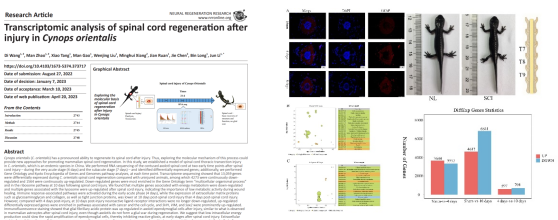 蝾螈的再生能力极强,其一生均存在修复受损脊髓的能力,如果能够探明蝾螈脊髓再生的分子机制,将为实现哺乳动物脊髓再生研究提供思路。李君等选取在中国广泛分布的东方蝾螈作为实验对象,从构建脊髓损伤模型开始,通过组织化学和行为学方法研究了脊髓损伤修复的过程,通过对假手术组以及损伤4和10d时的脊髓进行转录组测序筛选出脊髓损伤不同时期的差异基因表达谱,最后分析了可能参与脊髓损伤和修复的信号通路和相关基因。该团队的研究结果表明东方蝾螈脊髓损伤早期体内的低新陈代谢、低细胞黏附、高免疫反应,为神经元再生提供了一个有利的细胞外环境,该成果将为哺乳动物脊髓损伤的研究与治疗提供重要线索。