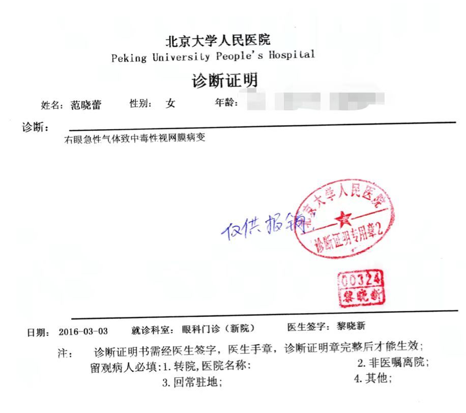 八年前,北京大学教师范晓蕾因右眼视物部分遮挡求医。在北京熙仁医院接受注气术治疗时,她的右眼被注入工业用全氟丙烷(又称八氟丙烷)气体。随后范晓蕾的右眼被诊断为“中毒性视网膜病变/右眼缺血性视网膜病变,视力明显下降”。