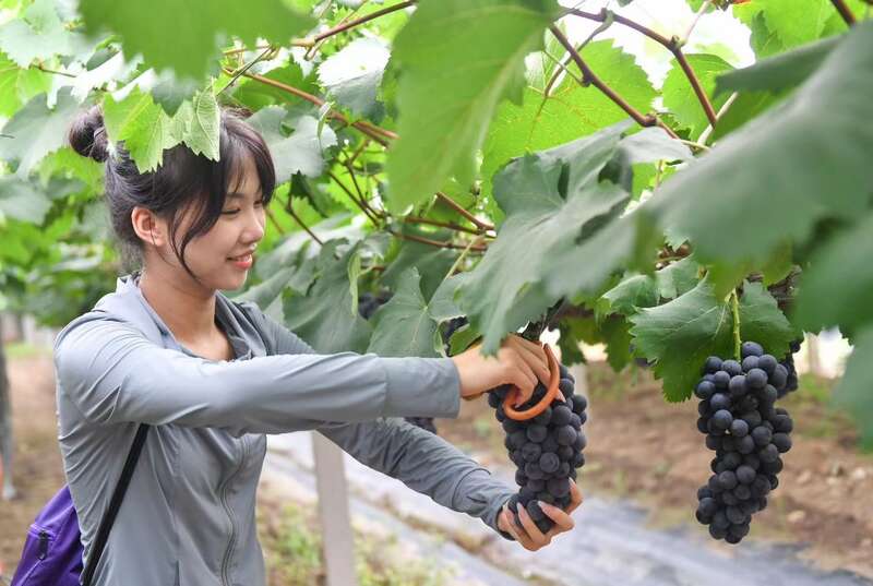 游客在采摘大圩葡萄。 叶玉庭/摄