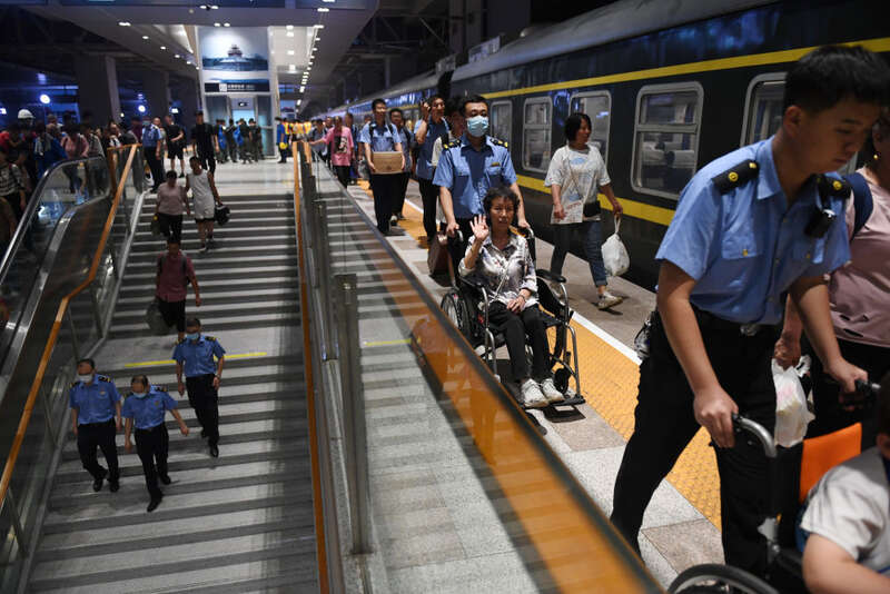 8月2日5时30分,首批丰沙线K396次列车滞留旅客抵达斜河涧站,统一乘车到达北京丰台站。