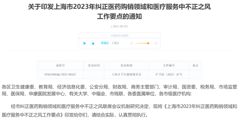 此外,多地监管部门也开始行动起来,例如8月7日,上海市卫健委等多部门印发《上海市2023年纠正医药购销领域和医疗服务中心不正之风工作要点》的通知,通知提到,整治行业重点领域的不正之风问题,包括整治行业组织存在的不正之风问题和整治医药产品销售采购中的不正之风问题。