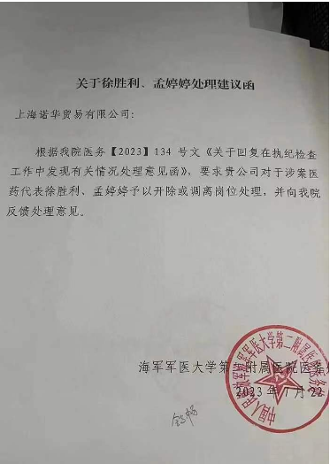 此次反腐风暴之下,国外药企也未能完全隐身。8月7日,一张网传图片显示,近日海军军医大学第二附属医院(又名“上海长征医院”)分别向上海诺华贸易有限公司和北京诺华制药有限公司发送处理建议函,要求两家公司分别对涉案的4位医药代表予以开除或调离岗位处理,并且向该院反馈处理意见。