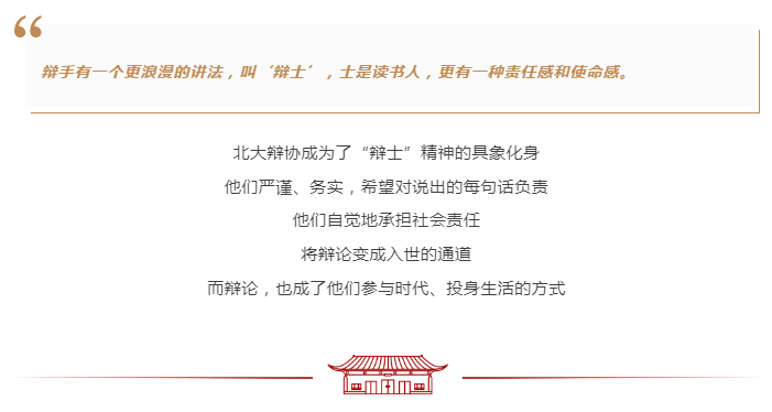 他们用思辨的眼光打量生活,以辩士的精神参与社会,共同搭建起“以辩论入世”的平台,将打向竞技场的聚光灯,照进现实,创造属于“北大辩协”的故事。