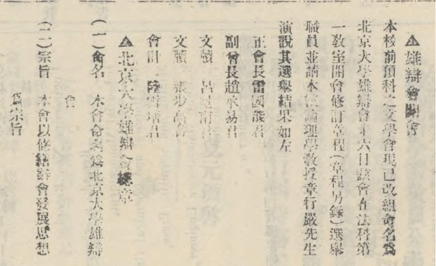 1917年,北大预科文学会邀请章士钊先生进行演说,正式成立北京大学雄辩会,日常演习辩论,以为“思想锐敏,言词畅适之训练”。