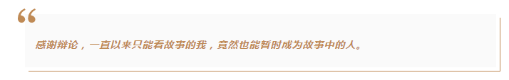 但是,辩论让我们重新拥有了进入故事的可能。辩论的故事性恰恰源于其竞技属性,凡是竞技,就有胜利,有失败,有喜悦,也有遗憾和落寞。竞技很残酷,所以它很美,辩论亦是这般,因此才有了故事。