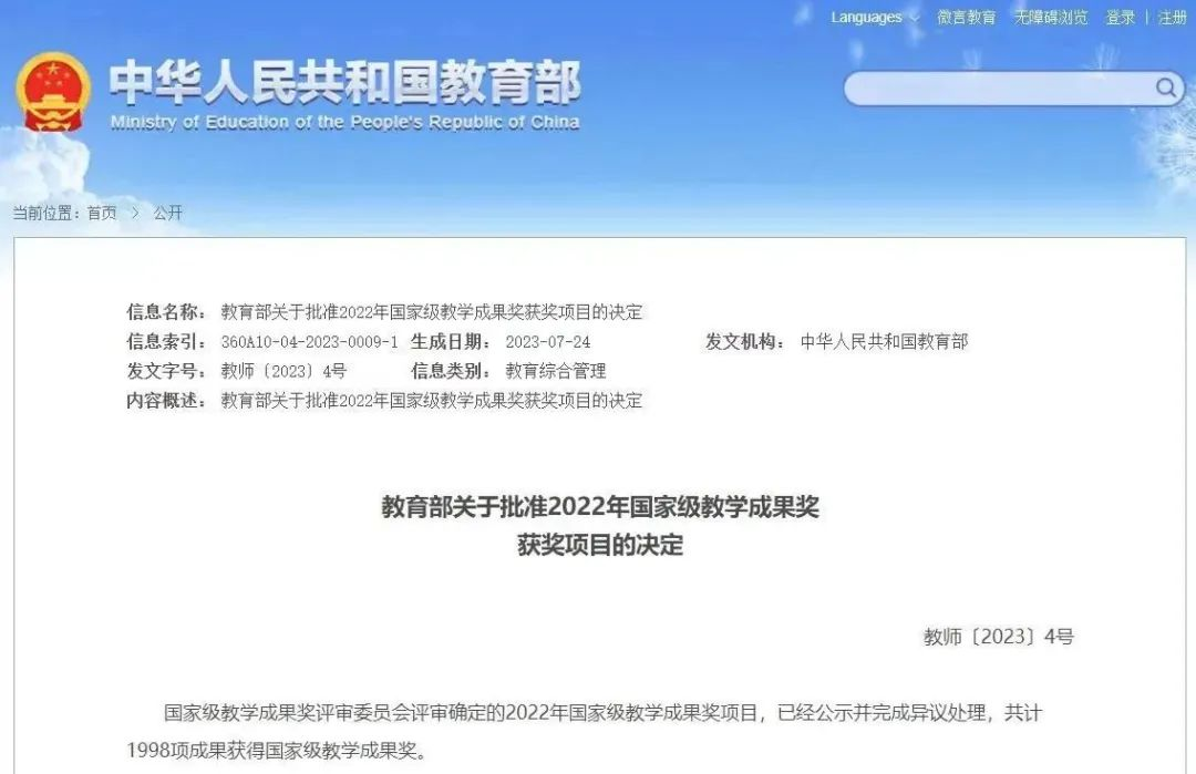 国家级教学成果奖是教育部为奖励取得教学成果的集体和个人,鼓励教育工作者从事教育教学研究,提高教学水平和教育质量而设立的最高级别的奖励,每4年评选一次。本次获奖成果是对我校教育教学工作特色经验的梳理和凝练,更是对我校人才培养成效的充分展示,是我校回应落实立德树人根本任务,深化教育教学改革,提升人才培养质量交出的优异答卷。