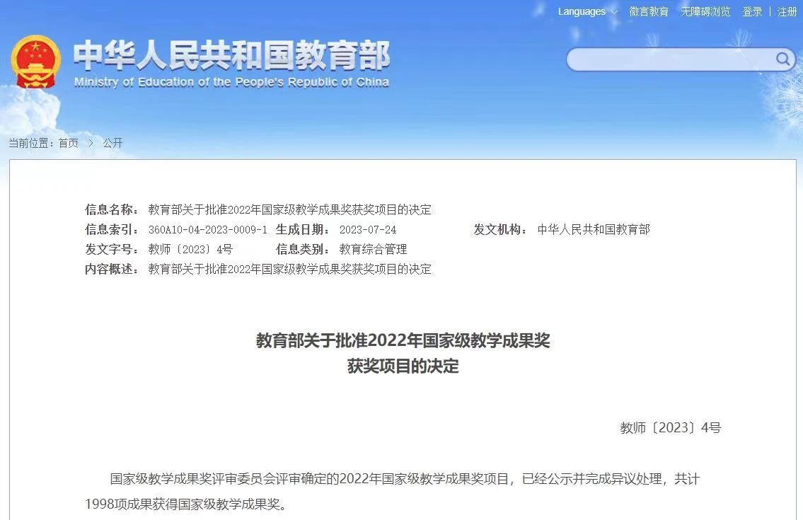 高等教育国家级教学成果奖是国务院确定的国家级奖励,每四年评选一次,是国家加快建设教育强国、落实立德树人根本任务的重要举措,是对学校人才培养工作和教育教学改革成果的检阅和展示。本次获奖项目,是广大教育工作者坚守三尺讲台、潜心教书育人取得的创新性成果,充分体现了近年来广大教育工作者在立德树人、教书育人、严谨笃学、教学改革方面所取得的进展和成绩。