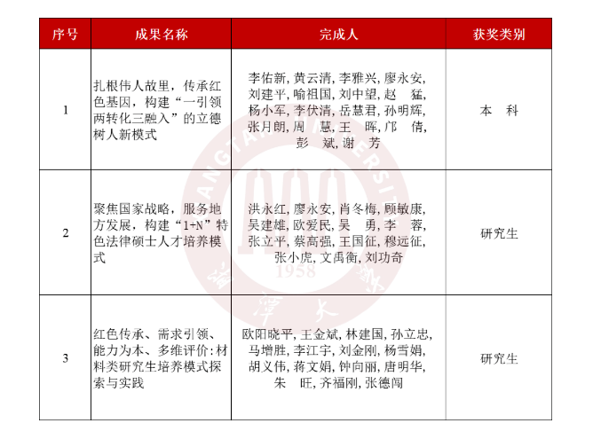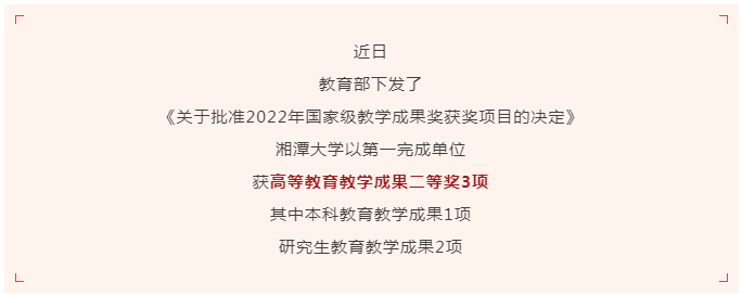 国家级教学成果奖励工作是加快建设教育强国、落实立德树人根本任务的重要举措,是对学校人才培养工作和教育教学改革成果的检阅和展示。本次获奖成果充分体现了近年来我校深入贯彻落实习近平总书记对湘潭大学重要批示精神,以提高人才培养质量为核心,不断深化教育教学改革,全面推进一流本科教育、卓越研究生教育取得的重大成就,将有力助推学校“双一流”建设与高质量发展。