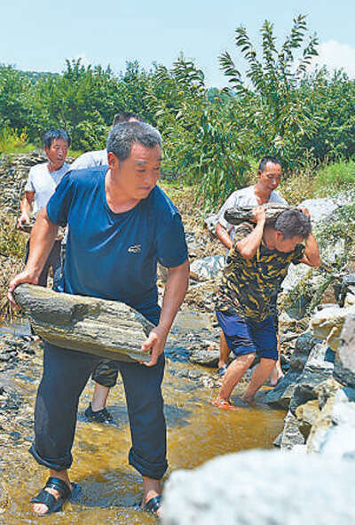 八月四日,河北省邢台市信都区路罗村党员和群众用石头砌实被冲毁的路基。