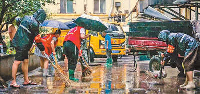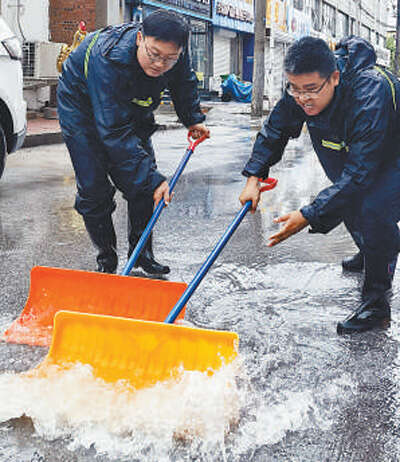 日前,河北省廊坊市广阳区解放道街道党员干部在清理积水。