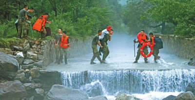 8月3日,北京卫戍区某团党员突击队在昌平区流村镇转移受灾群众。