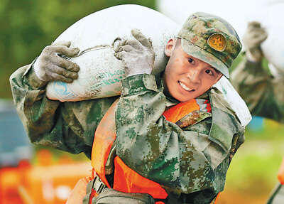 8月12日,陆军第78集团军某旅党员突击队在吉林省扶余市拉林河杨家崴子段加固堤坝。图为该旅入党积极分子王豪在搬运沙袋。