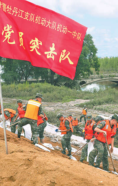 8月9日,武警黑龙江总队牡丹江支队组织党员突击队在牡丹江市东安区大湾村加固子堤。